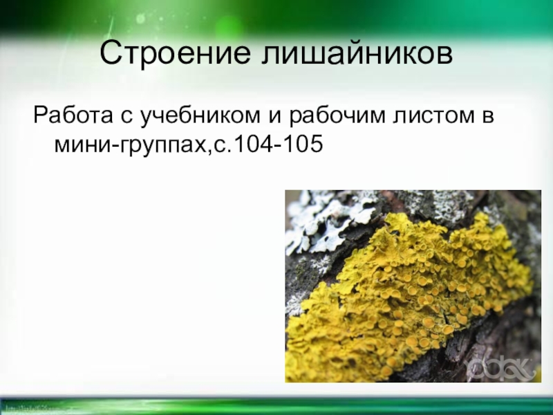 Строение лишайниковРабота с учебником и рабочим листом в мини-группах,с.104-105