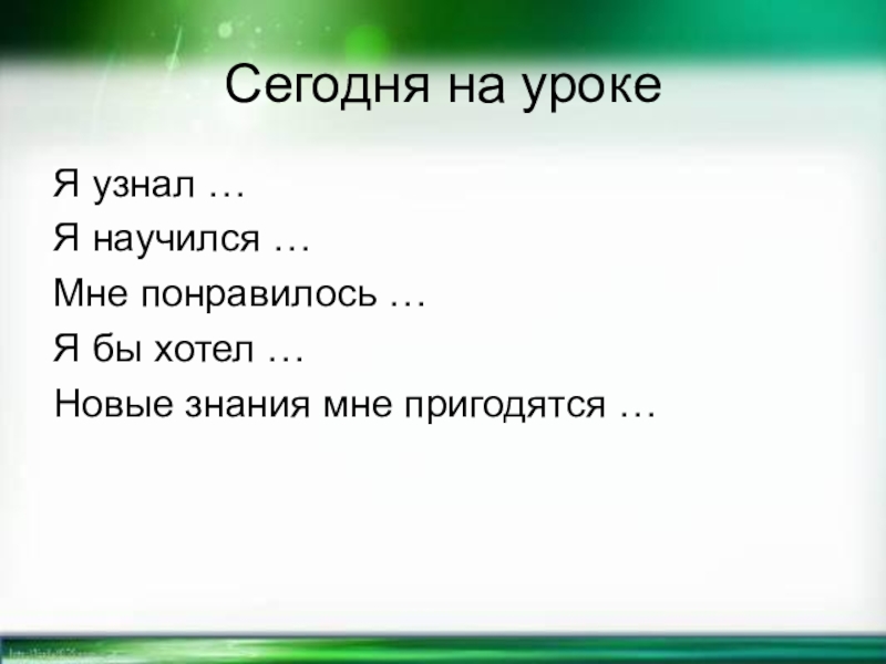 Сегодня на уроке Я узнал …Я научился …Мне понравилось …Я бы хотел …Новые знания мне пригодятся …