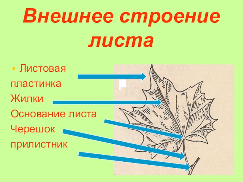 Внешнее строение листаЛистовая пластинкаЖилкиОснование листаЧерешокприлистник