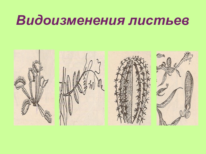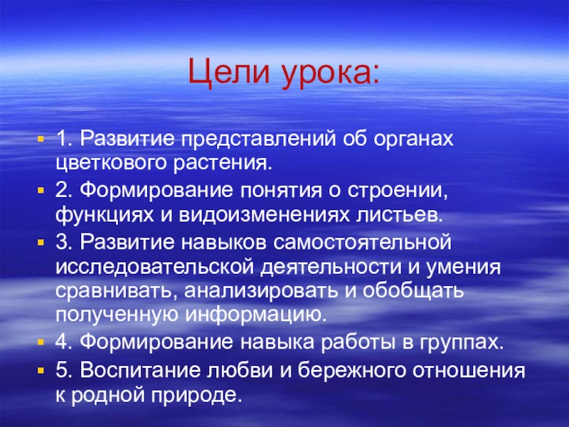 Цели урока:1. Развитие представлений об органах цветкового растения.2. Формирование понятия о строении, функциях и видоизменениях листьев.3. Развитие навыков самостоятельной исследовательской деятельности и умения сравнивать, анализировать и обобщать полученную информацию.4. Формирование навыка работы в группах.5. Воспитание любви