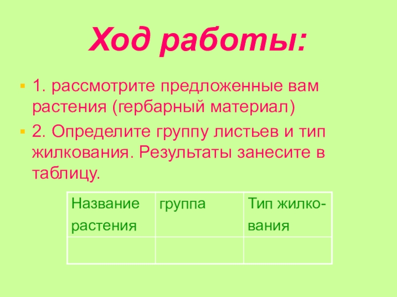 Ход работы:1. рассмотрите предложенные вам растения (гербарный материал)2. Определите группу листьев и тип жилкования. Результаты занесите в