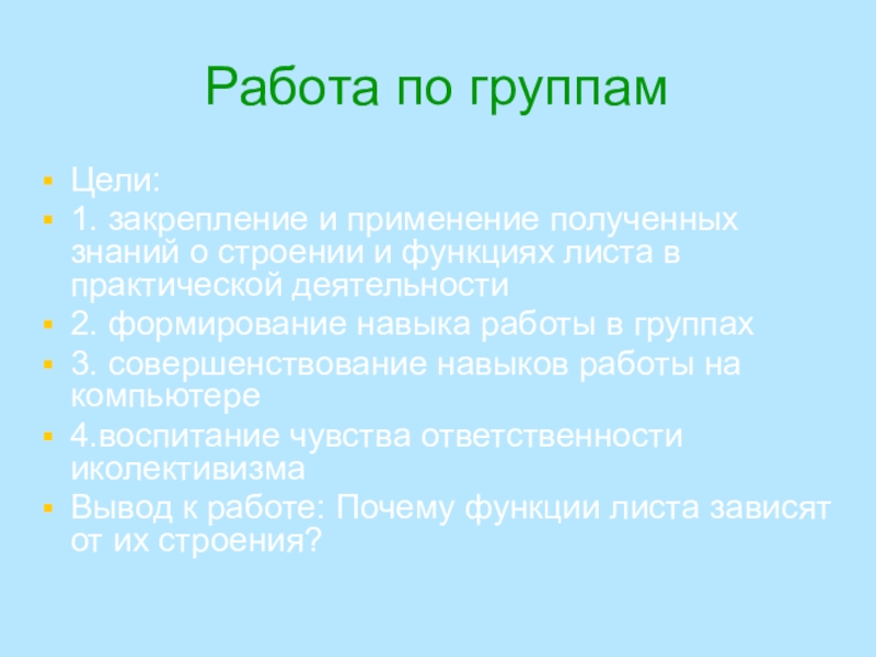 Работа по группамЦели:1. закрепление и применение полученных знаний о строении и функциях листа в практической деятельности2. формирование