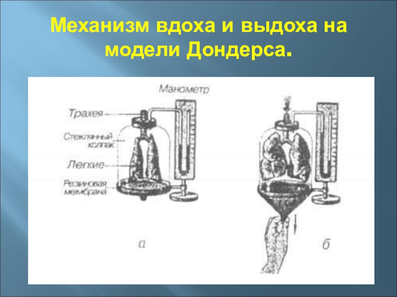 Слайд 10Механизм вдоха и выдоха на модели Дондерса.