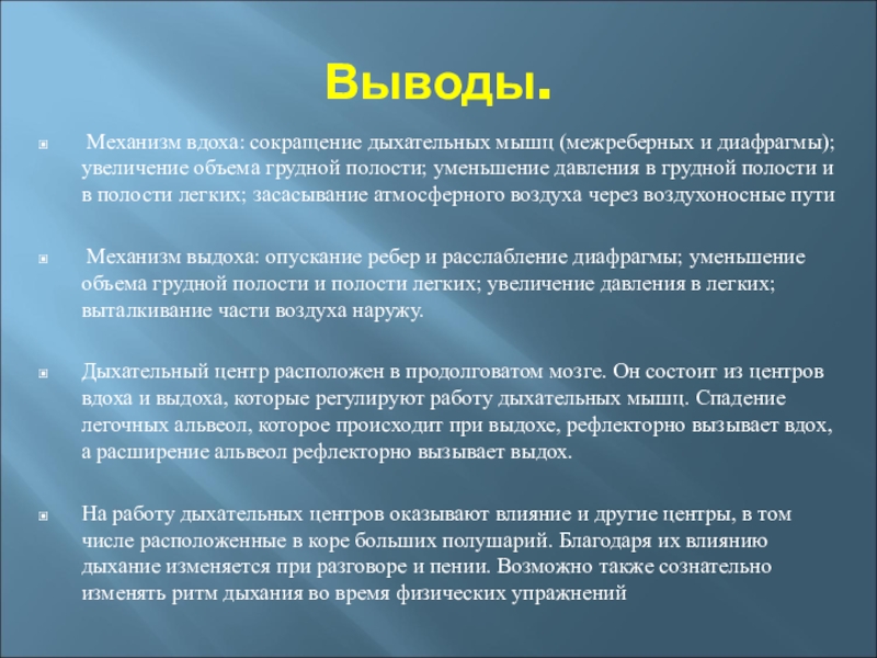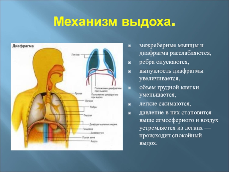 Механизм выдоха: опускание ребер и расслабление диафрагмы; уменьшение объема грудной полости и полости легких; увеличение давления в легких; выталкивание части воздуха наружу.
