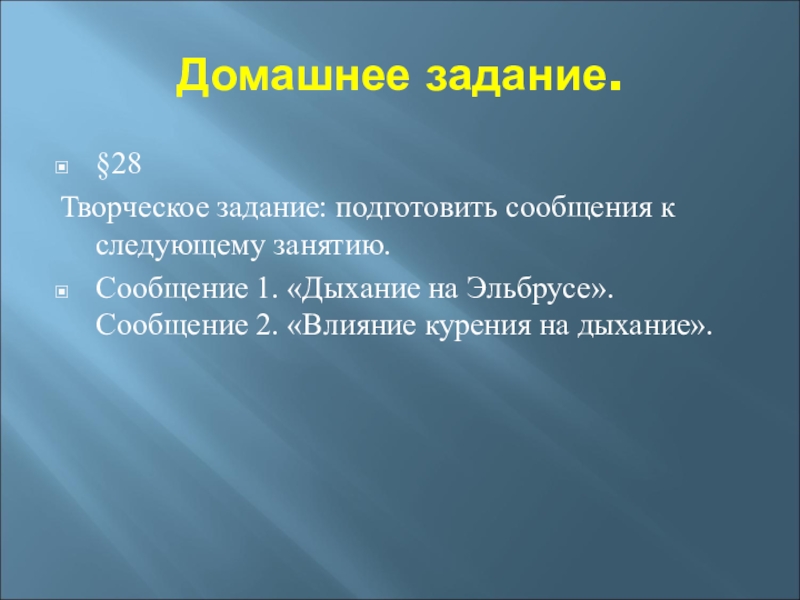 Творческое задание: подготовить сообщения к следующему занятию.