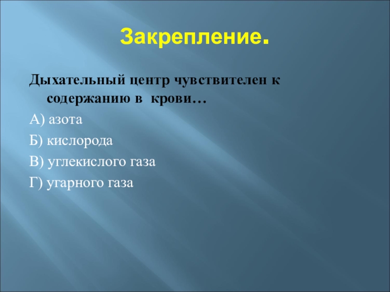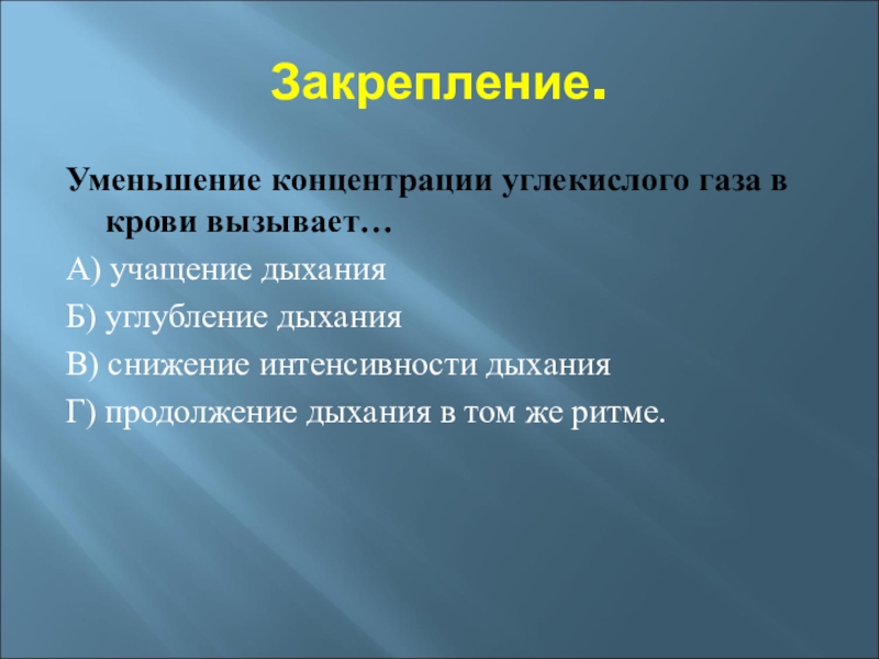 Гуморальная регуляция дыхания -повышение концентрации СО2 в крови возбуждает дыхательный центр — частота и глубина дыхания увеличиваются. Уменьшение содержания СО2 в крови понижает возбудимость дыхательного центра — частота и глубина дыхания уменьшаются.