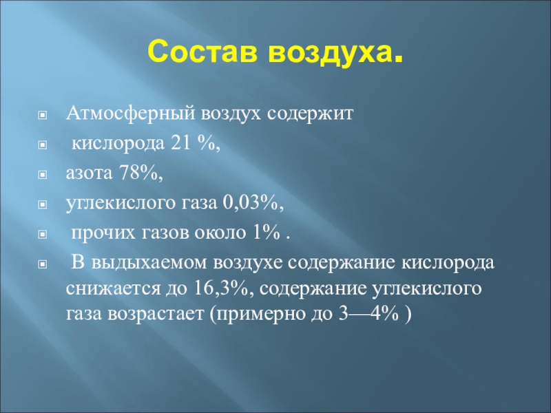 В выдыхаемом воздухе содержание кислорода снижается до 16,3%, содержание углекислого газа возрастает (примерно до 3—4% )