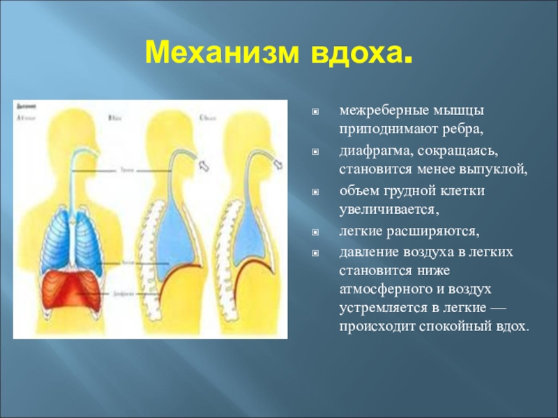 давление воздуха в легких становится ниже атмосферного и воздух устремляется в легкие — происходит спокойный вдох.