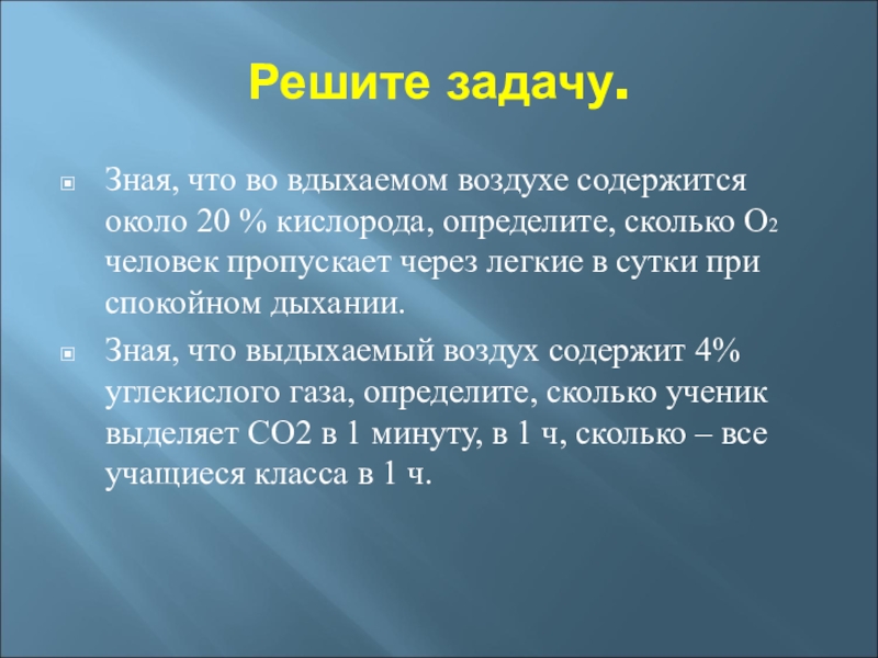 Зная, что выдыхаемый воздух содержит 4% углекислого газа, определите, сколько ученик выделяет СО2 в 1 минуту, в 1 ч, сколько – все учащиеся класса в 1 ч.