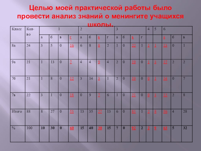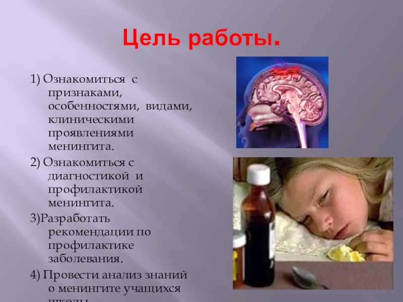 Слайд 18Целью моей практической работы было провести анализ знаний о менингите учащихся