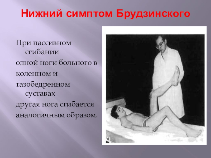 Слайд 11Нижний симптом Брудзинского