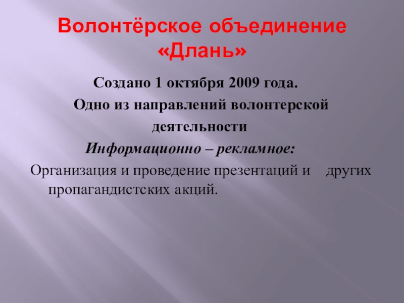 Слайд 22Волонтёрское объединение «Длань»