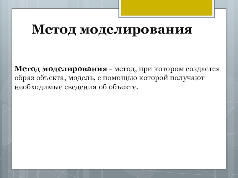 Метод моделированияМетод моделирования - метод, при котором создается образ объекта, модель, с помощью которой получают необходимые сведения