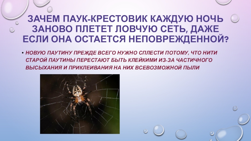 НОВУЮ ПАУТИНУ ПРЕЖДЕ ВСЕГО НУЖНО СПЛЕСТИ ПОТОМУ, ЧТО НИТИ СТАРОЙ ПАУТИНЫ ПЕРЕСТАЮТ БЫТЬ КЛЕЙКИМИ ИЗ-ЗА ЧАСТИЧНОГО ВЫСЫХАНИЯ И ПРИКЛЕИВАНИЯ НА НИХ ВСЕВОЗМОЖНОЙ ПЫЛИ
