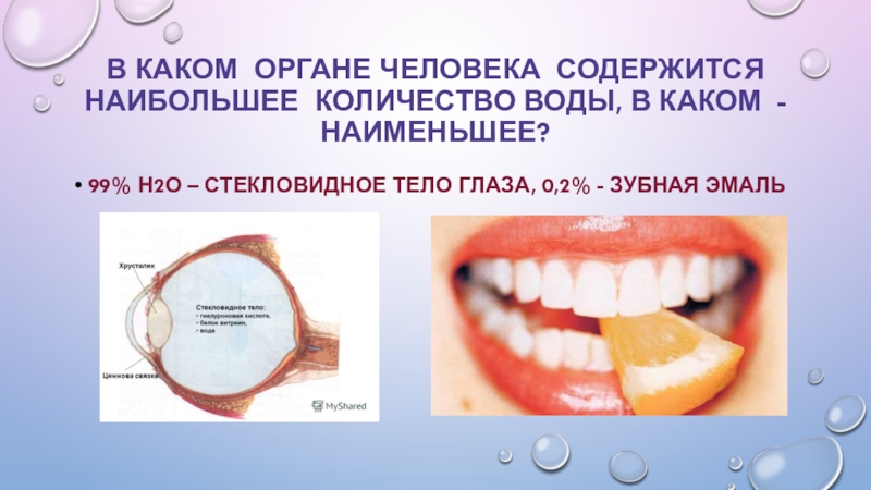 99% Н2О – СТЕКЛОВИДНОЕ ТЕЛО ГЛАЗА, 0,2% - ЗУБНАЯ ЭМАЛЬ