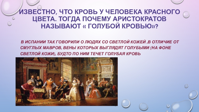 В ИСПАНИИ ТАК ГОВОРИЛИ О ЛЮДЯХ СО СВЕТЛОЙ КОЖЕЙ ,В ОТЛИЧИЕ ОТ СМУГЛЫХ МАВРОВ, ВЕНЫ КОТОРЫХ ВЫГЛЯДЯТ ГОЛУБЫМИ (НА ФОНЕ СВЕТЛОЙ КОЖИ), БУДТО ПО НИМ ТЕЧЕТ ГОЛУБАЯ КРОВЬ