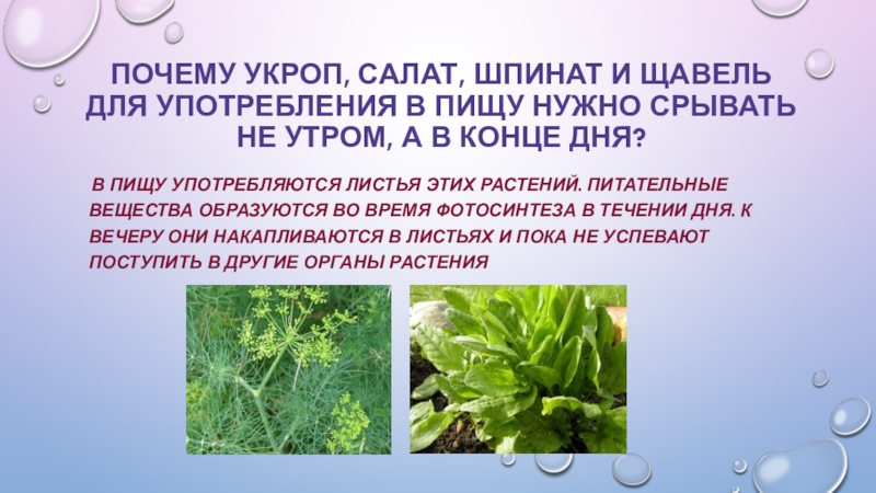 В ПИЩУ УПОТРЕБЛЯЮТСЯ ЛИСТЬЯ ЭТИХ РАСТЕНИЙ. ПИТАТЕЛЬНЫЕ ВЕЩЕСТВА ОБРАЗУЮТСЯ ВО ВРЕМЯ ФОТОСИНТЕЗА В ТЕЧЕНИИ ДНЯ. К ВЕЧЕРУ ОНИ НАКАПЛИВАЮТСЯ В ЛИСТЬЯХ И ПОКА НЕ УСПЕВАЮТ ПОСТУПИТЬ В ДРУГИЕ ОРГАНЫ РАСТЕНИЯ
