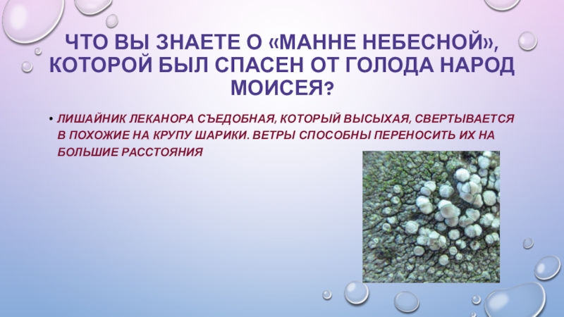 ЛИШАЙНИК ЛЕКАНОРА СЪЕДОБНАЯ, КОТОРЫЙ ВЫСЫХАЯ, СВЕРТЫВАЕТСЯ В ПОХОЖИЕ НА КРУПУ ШАРИКИ. ВЕТРЫ СПОСОБНЫ ПЕРЕНОСИТЬ ИХ НА БОЛЬШИЕ РАССТОЯНИЯ