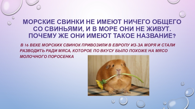 В 16 ВЕКЕ МОРСКИХ СВИНОК ПРИВОЗИЛИ В ЕВРОПУ ИЗ-ЗА МОРЯ И СТАЛИ РАЗВОДИТЬ РАДИ МЯСА, КОТОРОЕ ПО ВКУСУ БЫЛО ПОХОЖЕ НА МЯСО МОЛОЧНОГО ПОРОСЕНКА