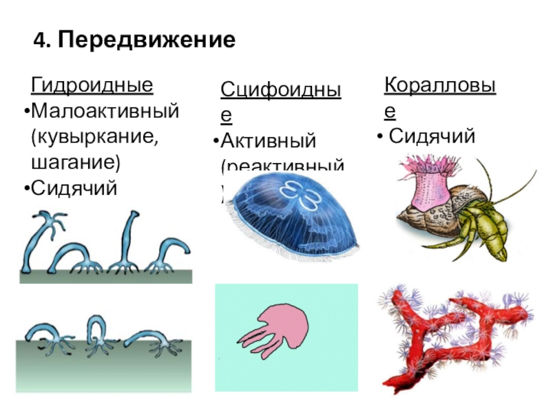 4. ПередвижениеГидроидныеМалоактивный (кувыркание, шагание)Сидячий СцифоидныеАктивный (реактивный) Коралловые Сидячий