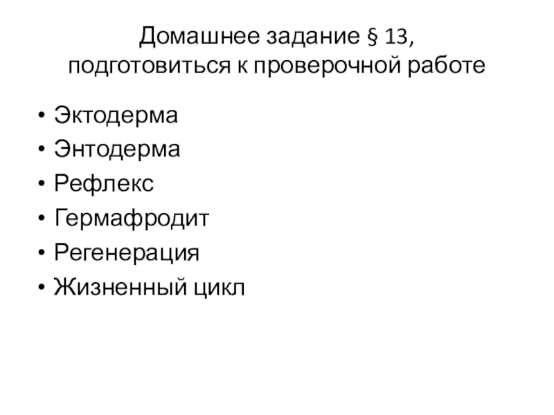 Домашнее задание § 13, подготовиться к проверочной работеЭктодермаЭнтодермаРефлексГермафродитРегенерацияЖизненный цикл