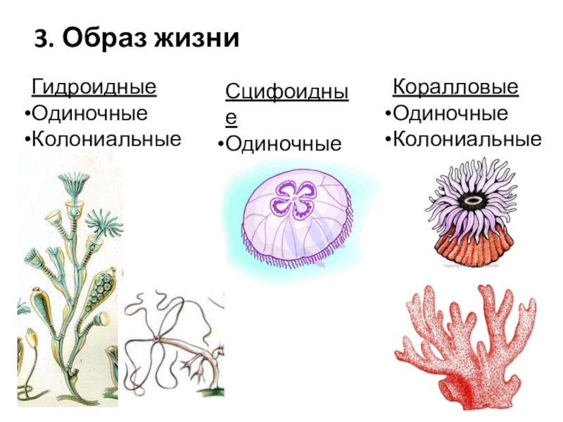 3. Образ жизниГидроидныеОдиночныеКолониальные СцифоидныеОдиночные КоралловыеОдиночныеКолониальные
