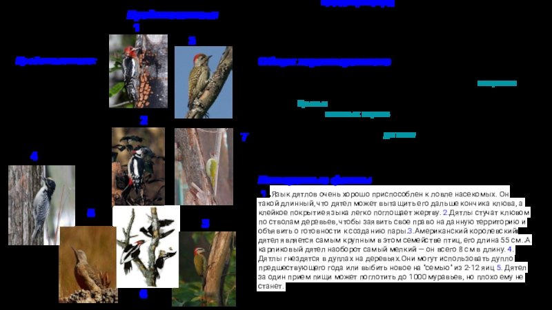 1..Язык дятлов очень хорошо приспособлен к ловле насекомых. Он такой длинный, что дятел может вытащить его дальше кончика клюва, а клейкое покрытие языка легко поглощает жертву. 2.Дятлы стучат клювом по стволам деревьев, чтобы заявить свое право на данную территорию и объявить о готовности к созданию пары.3.Американский королевский дятел является самым крупным в этом семействе птиц, его длина 55 см. А карликовый дятел наоборот самый мелкий — он всего 8 см в длину. 4.Дятлы гнездятся в дуплах на деревьях.Они могут использовать дупло предшествующего года или выбить новое на "семью" из 2-12 яиц 5. Дятел за один прием пищи может поглотить до 1000 муравьев, но плохо ему не станет.