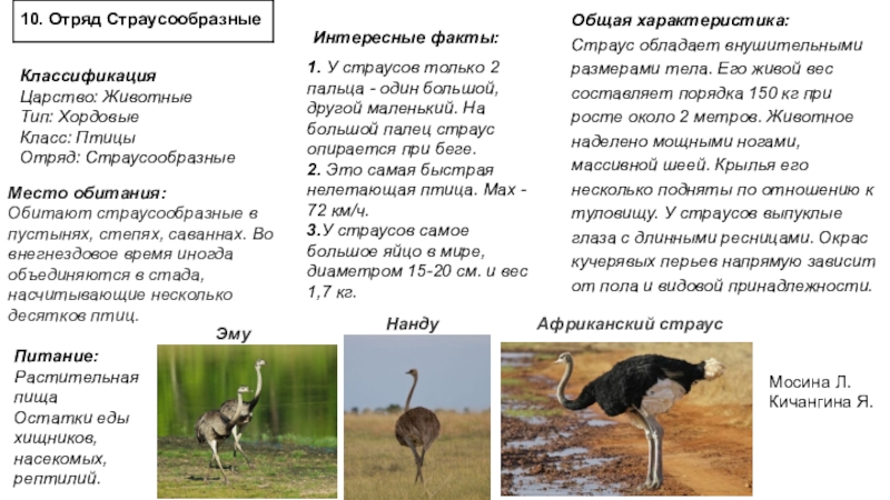 1. У страусов только 2 пальца - один большой, другой маленький. На большой палец страус опирается при беге.