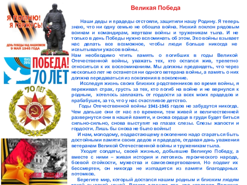 Я родился в счастливое, мирное время, но я много слышал, видел и читал о войне, ведь горе не обошло моих близких и родных. Уже семьдесят лет отделяют нас от суровых дней войны. Уходит поколение, вынесшее на плечах тяжелый груз испытаний. Но народная память вечно будет хранить ваше правое дело, ваши страдания, ваш подвиг. Мир не должен забывать ужасы войны. Это было бы преступлением перед павшими, преступлением перед будущим.