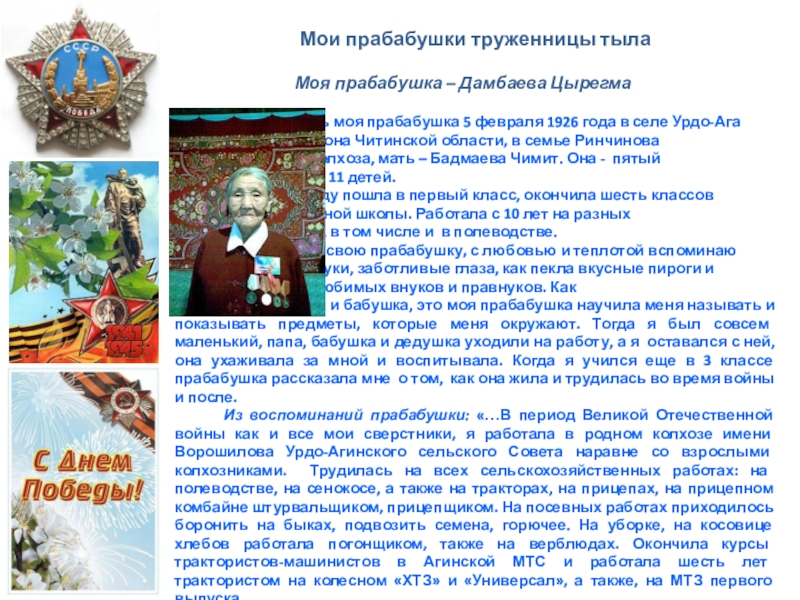 Из воспоминаний прабабушки: «…В период Великой Отечественной войны как и все мои сверстники, я работала в родном колхозе имени Ворошилова Урдо-Агинского сельского Совета наравне со взрослыми колхозниками. Трудилась на всех сельскохозяйственных работах: на полеводстве, на сенокосе, а также на тракторах, на прицепах, на прицепном комбайне штурвальщиком, прицепщиком. На посевных работах приходилось боронить на быках, подвозить семена, горючее. На уборке, на косовице хлебов работала погонщиком, также на верблюдах. Окончила курсы трактористов-машинистов в Агинской МТС и работала шесть лет трактористом на колесном «ХТЗ» и «Универсал», а также, на МТЗ первого выпуска.