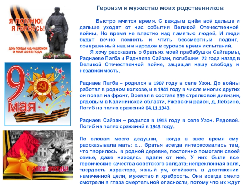 Я хочу рассказать о братьях моей прабабушки Сайгармы, Раднаеве Пагба и Раднаеве Сайзан, погибшим 72 года назад в Великой Отечественной войне, защищая нашу свободу и независимость.
