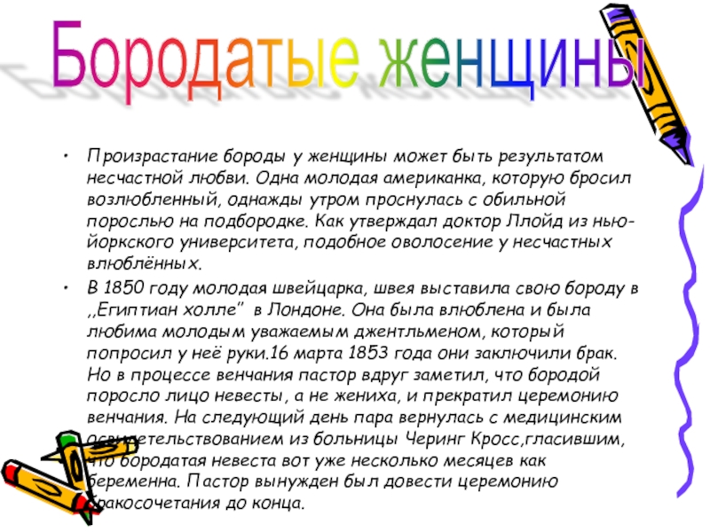 молодая американка, которую бросил возлюбленный, однажды утром проснулась с обильной порослью на подбородке. Как утверждал доктор Ллойд из нью-йоркского университета, подобное оволосение у несчастных влюблённых.