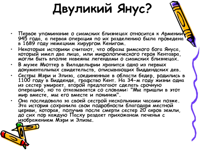 Некоторые историки считают, что образы римского бога Януса, который имел два лица, или мифологического героя Кентавра, могли быть вполне навеяны легендами о сиамских близнецах.