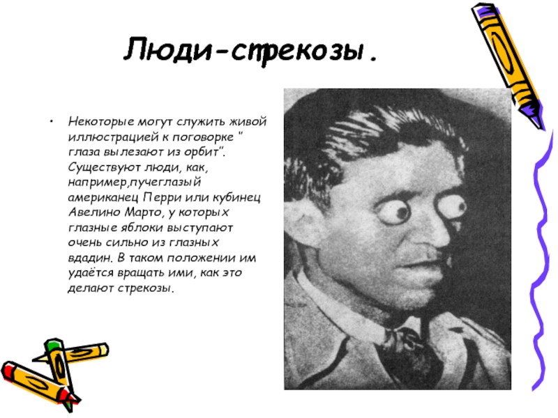 орбит’’. Существуют люди, как, например,пучеглазый американец Перри или кубинец Авелино Марто, у которых глазные яблоки выступают очень сильно из глазных вдадин. В таком положении им удаётся вращать ими, как это делают стрекозы.