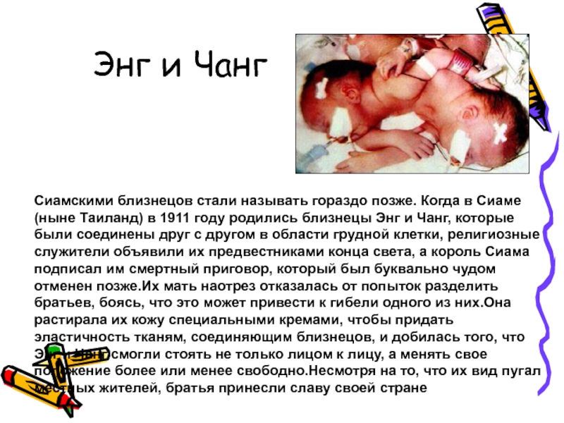 (ныне Таиланд) в 1911 году родились близнецы Энг и Чанг, которые были соединены друг с другом в области грудной клетки, религиозные служители объявили их предвестниками конца света, а король Сиама подписал им смертный приговор, который был буквально чудом отменен позже.Их мать наотрез отказалась от попыток разделить братьев, боясь, что это может привести к гибели одного из них.Она растирала их кожу специальными кремами, чтобы придать эластичность тканям, соединяющим близнецов, и добилась того, что Энг и Чанг смогли стоять не только лицом к лицу, а менять свое положение более или менее свободно.Несмотря на то, что их вид пугал местных жителей, братья принесли славу своей стране