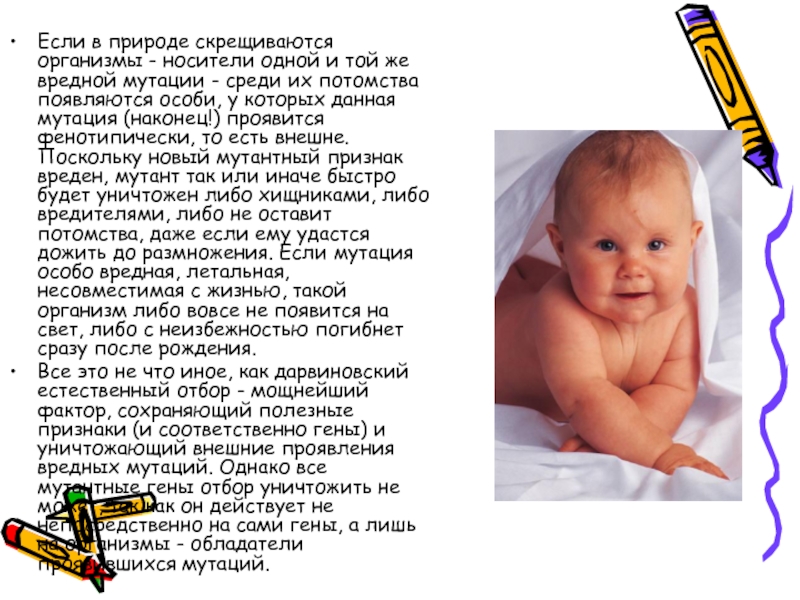вредной мутации - среди их потомства появляются особи, у которых данная мутация (наконец!) проявится фенотипически, то есть внешне. Поскольку новый мутантный признак вреден, мутант так или иначе быстро будет уничтожен либо хищниками, либо вредителями, либо не оставит потомства, даже если ему удастся дожить до размножения. Если мутация особо вредная, летальная, несовместимая с жизнью, такой организм либо вовсе не появится на свет, либо с неизбежностью погибнет сразу после рождения.