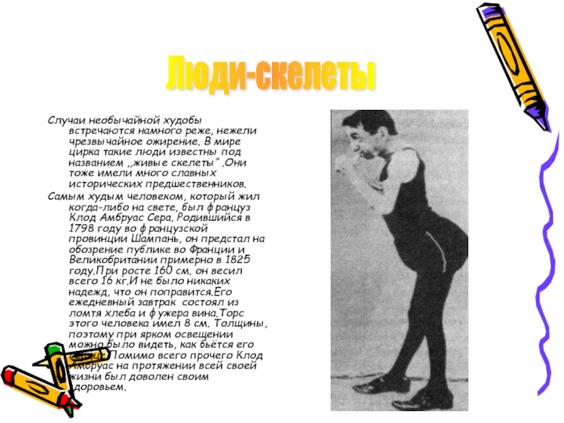 Самым худым человеком, который жил когда-либо на свете, был француз Клод Амбруас Сера. Родившийся в 1798 году во французской провинции Шампань, он предстал на обозрение публике во Франции и Великобритании примерно в 1825 году.При росте 160 см. он весил всего 16 кг.И не было никаких надежд, что он поправится.Его ежедневный завтрак состоял из ломтя хлеба и фужера вина.Торс этого человека имел 8 см. Толщины, поэтому при ярком освещении можно было видеть, как бьётся его сердце.Помимо всего прочего Клод Амбруас на протяжении всей своей жизни был доволен своим здоровьем.