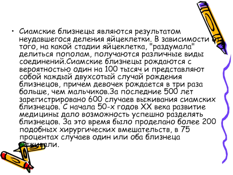 на какой стадии яйцеклетка, "раздумала" делиться пополам, получаются различные виды соединений.Сиамские близнецы рождаются с вероятностью один на 100 тысяч и представляют собой каждый двухсотый случай рождения близнецов, причем девочек рождается в три раза больше, чем мальчиков.За последние 500 лет зарегистрировано 600 случаев выживания сиамских близнецов. С начала 50-х годов XX века развитие медицины дало возможность успешно разделять близнецов. За это время было проделано более 200 подобных хирургических вмешательств, в 75 процентах случаев один или оба близнеца выживали.