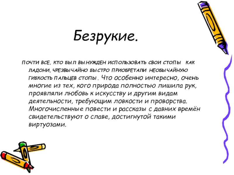 ЧРЕЗВЫЧАЙНО БЫСТРО ПРИОБРЕТАЛИ НЕОБЫЧАЙНУЮ ГИБКОСТЬ ПАЛЬЦЕВ СТОПЫ. Что особенно интересно, очень многие из тех, кого природа полностью лишила рук, проявляли любовь к искусству и другим видам деятельности, требующим ловкости и проворства. Многочисленные повести и рассказы с давних времён свидетельствуют о славе, достигнутой такими виртуозами.