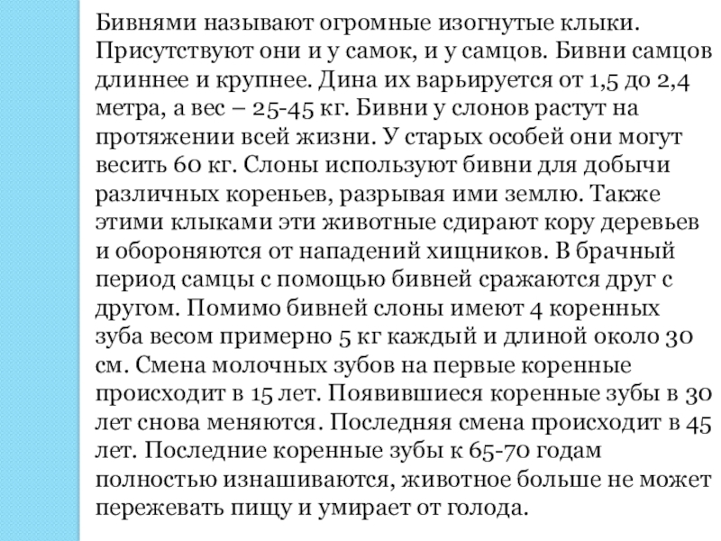 у самцов. Бивни самцов длиннее и крупнее. Дина их варьируется от 1,5 до 2,4 метра, а вес – 25-45 кг. Бивни у слонов растут на протяжении всей жизни. У старых особей они могут весить 60 кг. Слоны используют бивни для добычи различных кореньев, разрывая ими землю. Также этими клыками эти животные сдирают кору деревьев и обороняются от нападений хищников. В брачный период самцы с помощью бивней сражаются друг с другом. Помимо бивней слоны имеют 4 коренных зуба весом примерно 5 кг каждый и длиной около 30 см. Смена молочных зубов на первые коренные происходит в 15 лет. Появившиеся коренные зубы в 30 лет снова меняются. Последняя смена происходит в 45 лет. Последние коренные зубы к 65-70 годам полностью изнашиваются, животное больше не может пережевать пищу и умирает от голода.