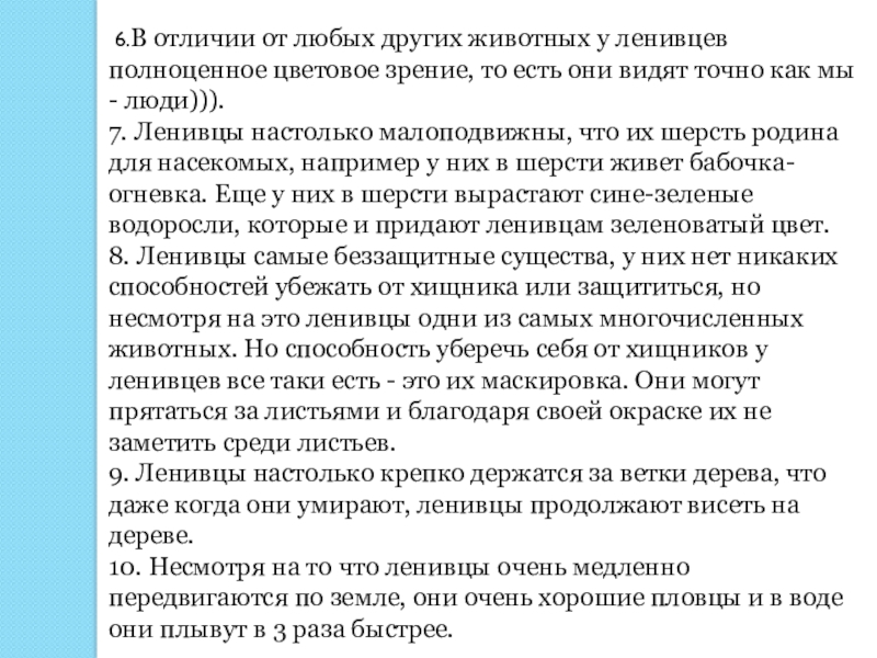 Слайд 23 6.В отличии от любых других животных у ленивцев полноценное цветовое