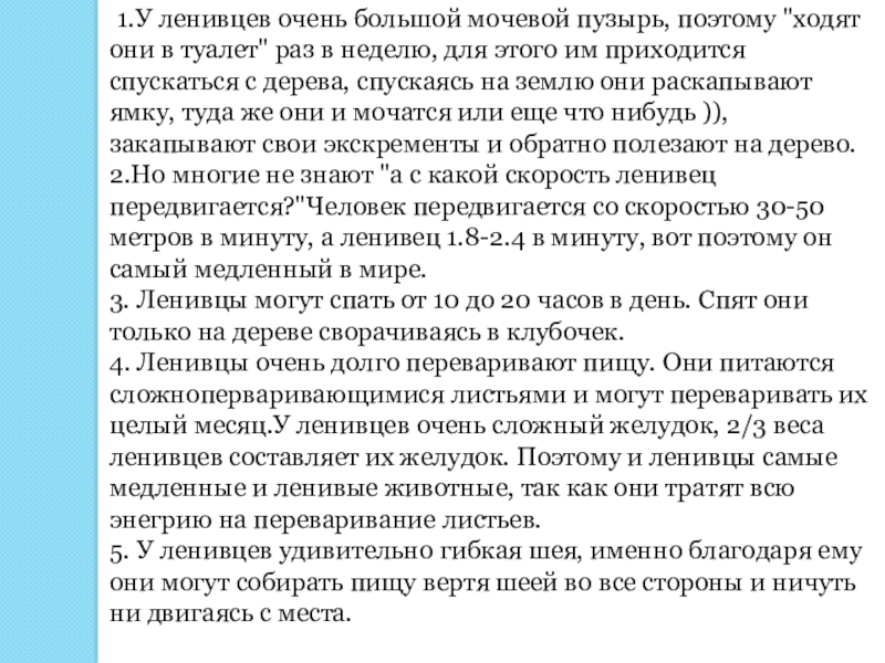 Слайд 22 1.У ленивцев очень большой мочевой пузырь, поэтому "ходят они в
