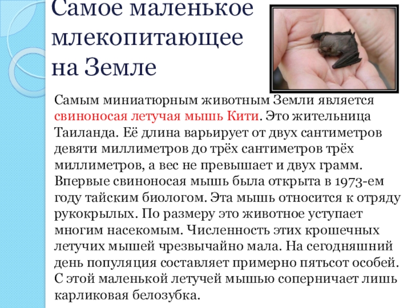 мышь Кити. Это жительница Таиланда. Её длина варьирует от двух сантиметров девяти миллиметров до трёх сантиметров трёх миллиметров, а вес не превышает и двух грамм. Впервые свиноносая мышь была открыта в 1973-ем году тайским биологом. Эта мышь относится к отряду рукокрылых. По размеру это животное уступает многим насекомым. Численность этих крошечных летучих мышей чрезвычайно мала. На сегодняшний день популяция составляет примерно пятьсот особей.