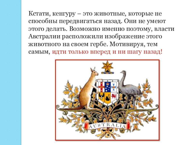 Слайд 6Кстати, кенгуру – это животные, которые не способны передвигаться назад. Они