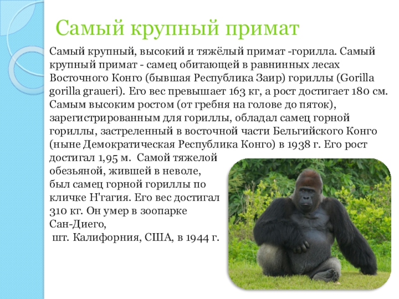 крупный примат - самец обитающей в равнинных лесах Восточного Конго (бывшая Республика Заир) гориллы (Gorilla gorilla graueri). Его вес превышает 163 кг, а рост достигает 180 см. Самым высоким ростом (от гребня на голове до пяток), зарегистрированным для гориллы, обладал самец горной гориллы, застреленный в восточной части Бельгийского Конго (ныне Демократическая Республика Конго) в 1938 г. Его рост достигал 1,95 м. Самой тяжелой