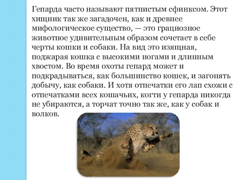 Слайд 8Гепарда часто называют пятнистым сфинксом. Этот хищник так же загадочен, как