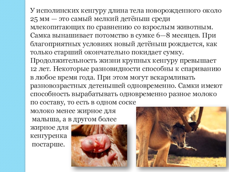 самый мелкий детёныш среди млекопитающих по сравнению со взрослым животным. Самка вынашивает потомство в сумке 6—8 месяцев. При благоприятных условиях новый детёныш рождается, как только старший окончательно покидает сумку. Продолжительность жизни крупных кенгуру превышает 12 лет. Некоторые разновидности способны к спариванию в любое время года. При этом могут вскармливать разновозрастных детенышей одновременно. Самки имеют способность вырабатывать одновременно разное молоко по составу, то есть в одном соске