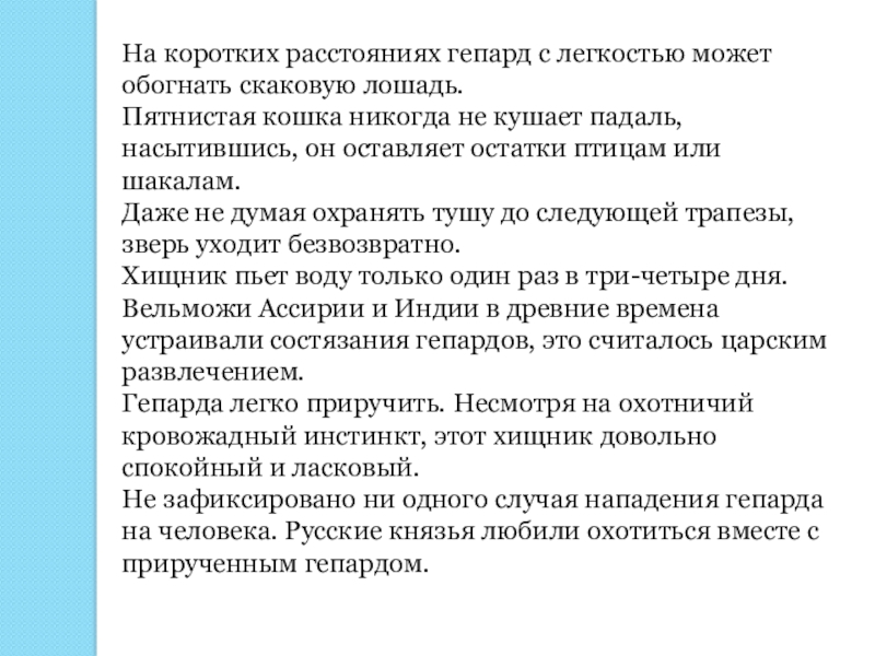 Хищник пьет воду только один раз в три-четыре дня. Вельможи Ассирии и Индии в древние времена устраивали состязания гепардов, это считалось царским развлечением.