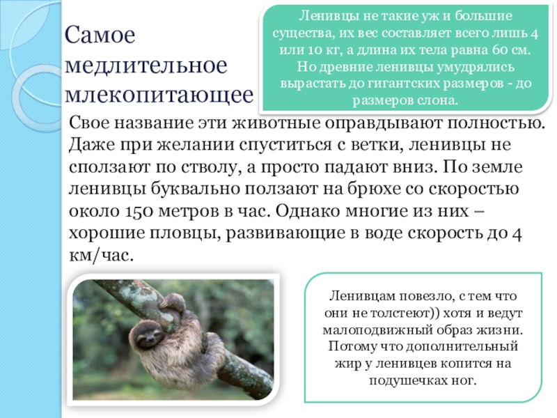 2.Но многие не знают "а с какой скорость ленивец передвигается?"Человек передвигается со скоростью 30-50 метров в минуту, а ленивец 1.8-2.4 в минуту, вот поэтому он самый медленный в мире.