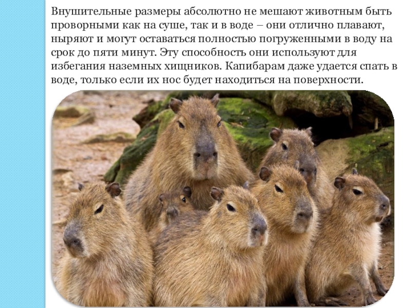 так и в воде – они отлично плавают, ныряют и могут оставаться полностью погруженными в воду на срок до пяти минут. Эту способность они используют для избегания наземных хищников. Капибарам даже удается спать в воде, только если их нос будет находиться на поверхности.